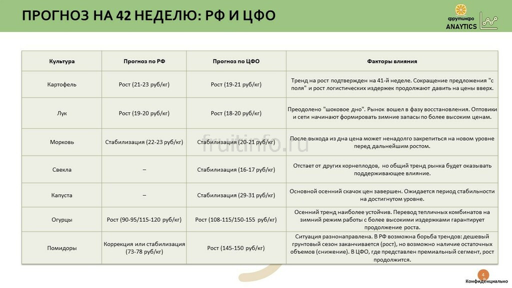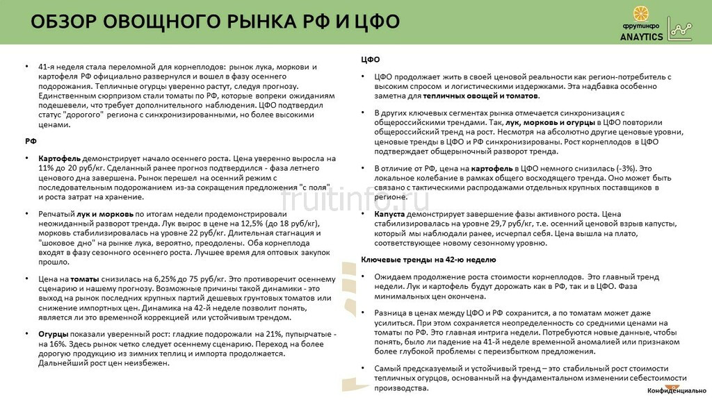 41-я неделя стала переломной для корнеплодов: рынок лука, моркови и картофеля РФ официально развернулся и вошел в фазу осеннего подорожания. Тепличные огурцы уверенно растут, следуя прогнозу. Единственным сюрпризом стали томаты по РФ, которые вопреки ожиданиям подешевели.