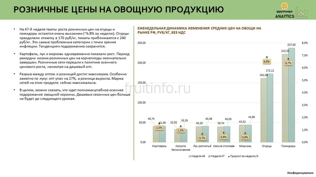На 47-й неделе темпы роста розничных цен на огурцы и помидоры остаются очень высокими (~6.8% за неделю). Огурцы преодолели отметку в 170 руб/кг, томаты приближаются к 240 руб/кг. Это самые проблемные категории с точки зрения инфляции. Тенденция к подорожанию сохранится.
