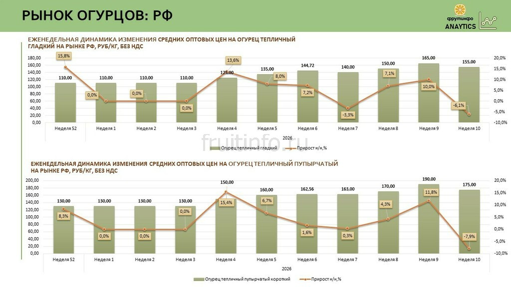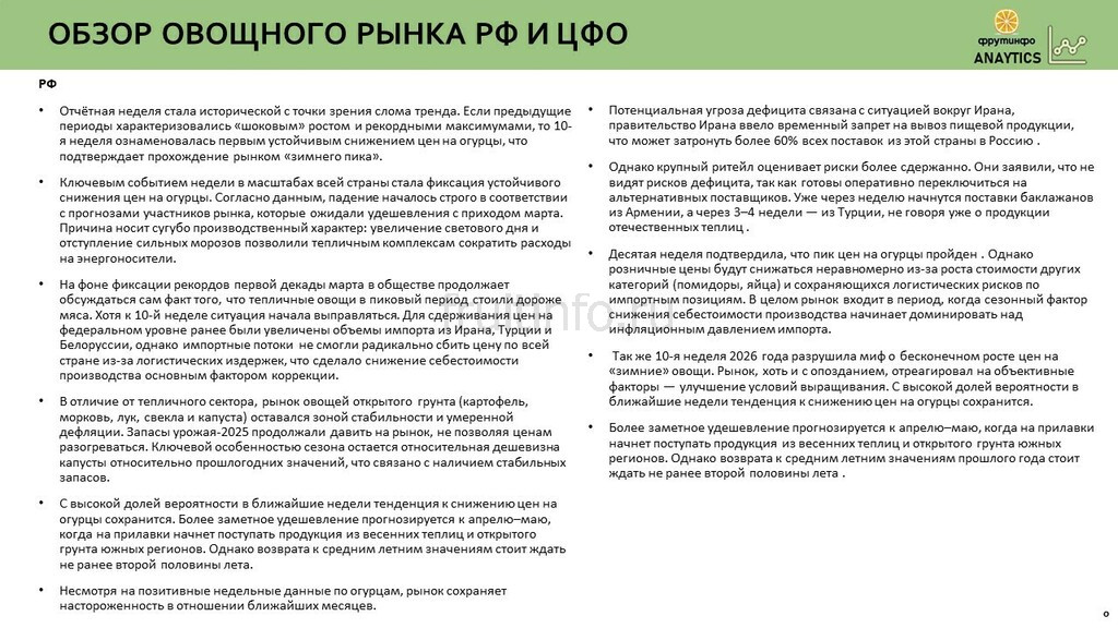 10-я неделя разрушила миф о бесконечном росте — рынок развернулся вслед за солнцем. Сезонный фактор снижения себестоимости наконец победил инфляционное давление. Впервые с начала зимнего сезона зафиксировано устойчивое снижение цен на огурцы. "Зимний пик" пройден. Снижение началось после того, как в пике огурцы стоили дороже мяса, вызвав широкий общественный резонанс. Поставки из Ирана, Турции и Белоруссии не могли радикально сбить цены из-за логистических издержек. Решающим фактором стало именно производственное удешевление.