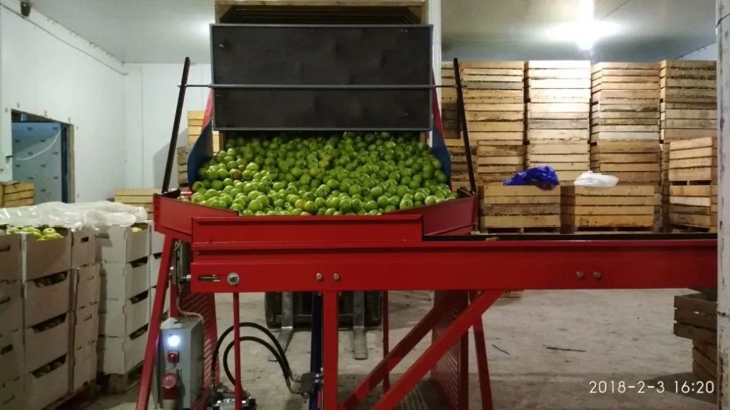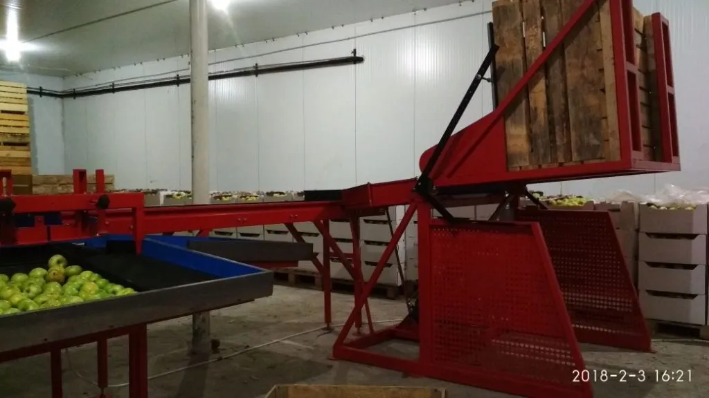 1. Контейнер с фруктами вставляется в опрокидыватель, который поднимается на определенную заданную величину. При отсутствии опрокидывателя, происходит ручная загрузка фруктов. Из контейнера (ящика) фрукты поступают на ленточный подающий транспортер и перемещаются к калибровочному модулю.