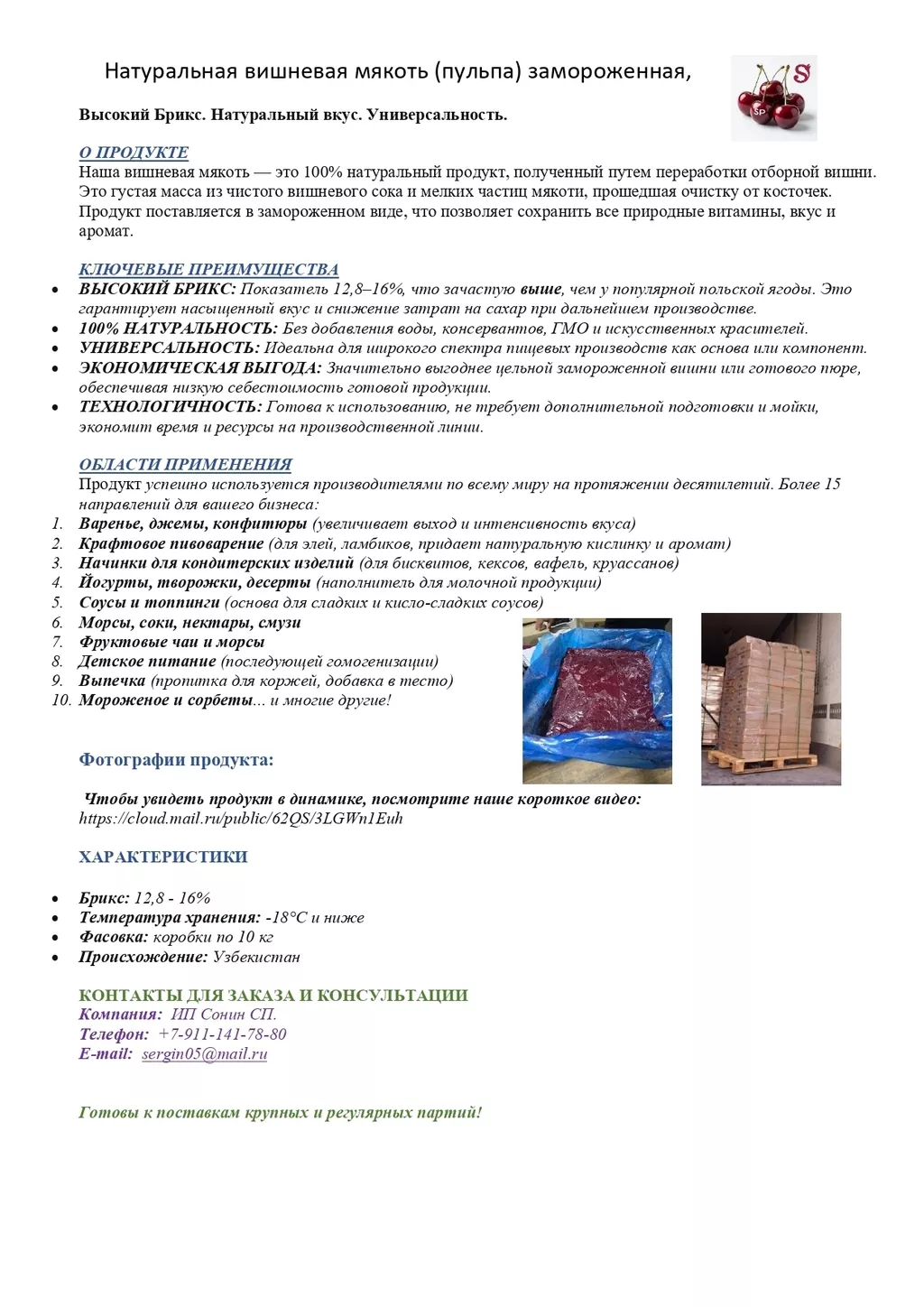 Мякоть вишни (пульпа) замороженная производство Узбекистан, коробки по 10 кг. Смотри презентацию (во вложении с фото)
